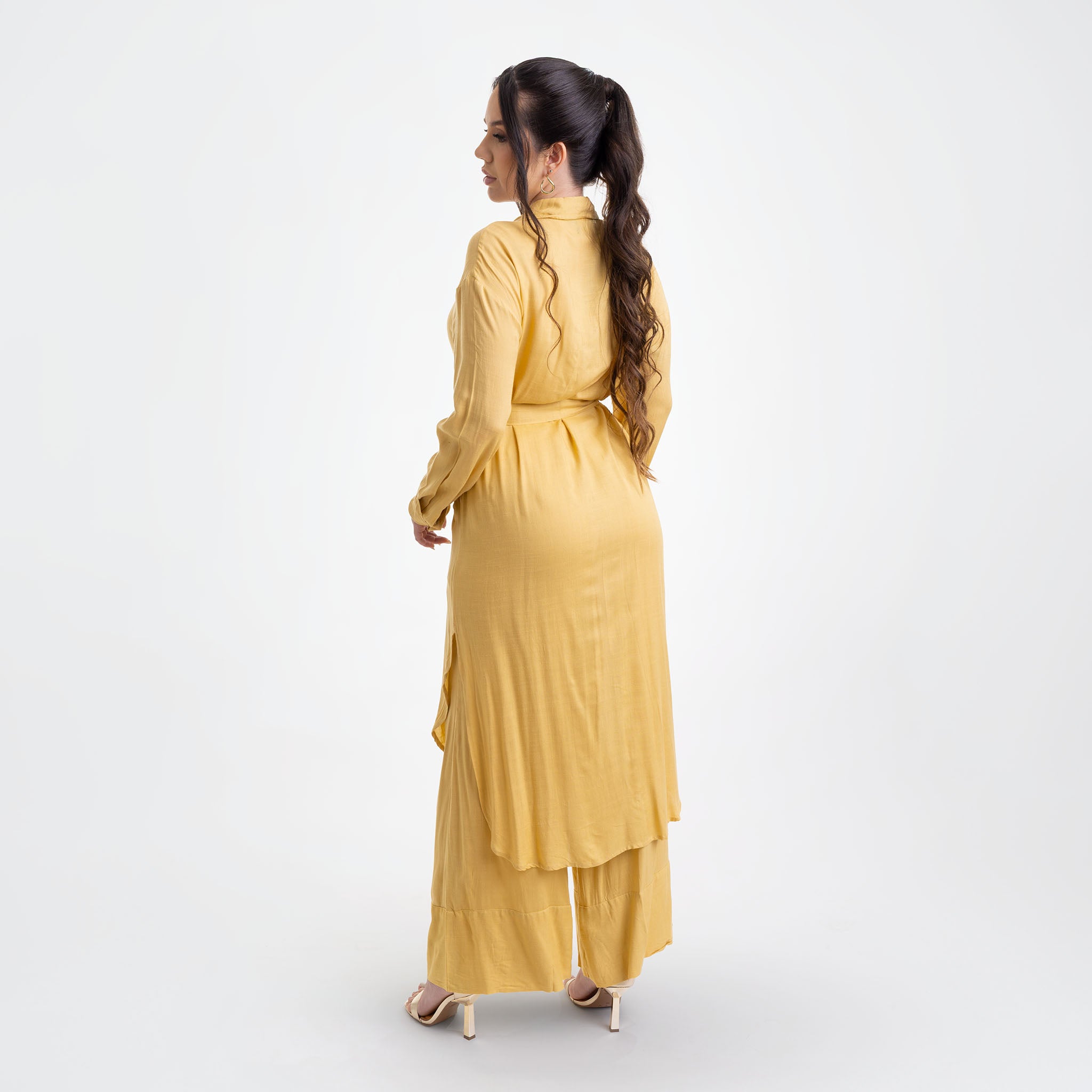 A chemise de botões apresenta caimento fluido e design atemporal, e acompanha faixa para amarrar, permitindo diferentes formas de uso e valorizando a silhueta com elegância.